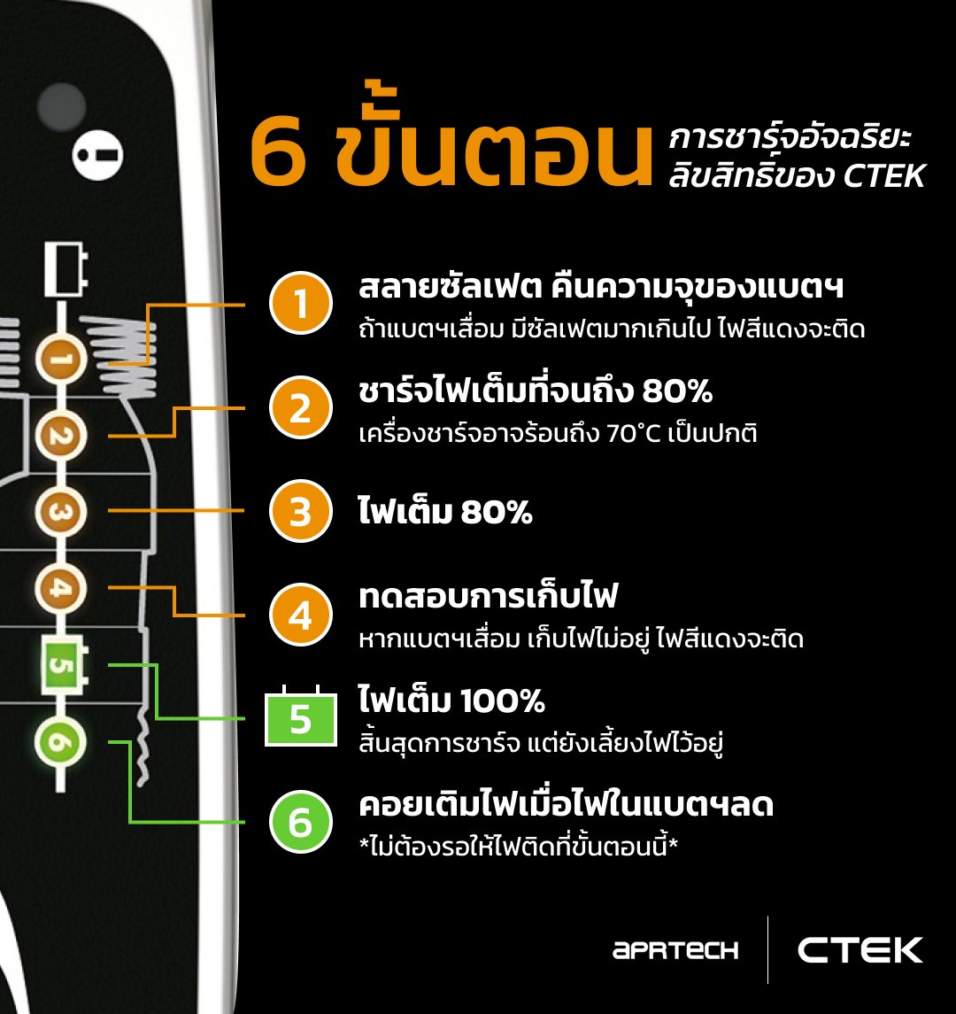 CTEK จะชาร์จแบตเตอรี่จนเต็มแล้วตัดไฟอัตโนมัติ ไม่ต้องเฝ้า หลังจากนั้นสามารถเสียบคาไว้ได้เป็นเดือน CTEK จะคอยเติมไฟให้แบตเตอรี่ไฟเต็มตลอด ทำให้แบตเตอรี่มีอายุการใช้งานเต็มประสิทธิภาพมากที่สุด