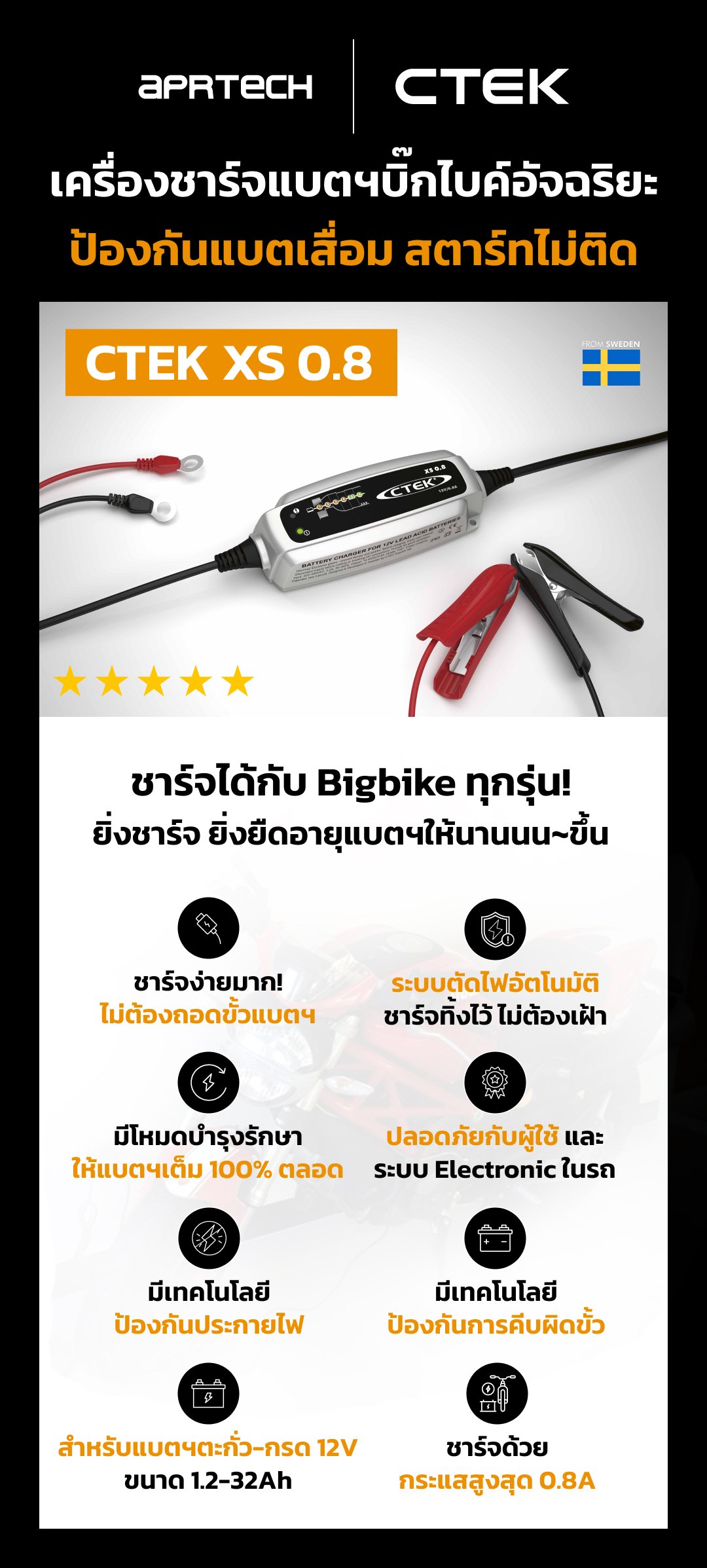 CTEK XS 0.8 เครื่องชาร์จแบตฯรถบิ๊กไบค์รุ่นที่ขายดีที่สุด (Best Seller) จากราคา 3,000 บาท ราคาโปรโมชั่น ลดเหลือเพียง 2,500 บาท รับประกันถึง 5 ปี สำหรับชาร์จแบตเตอรี่ตะกั่ว-กรด 12V ใช้ได้กับรถบิ๊กไบค์ทุกรุ่นทุกค่าย ไม่ว่ารถยุโรปหรือรถญี่ปุ่น แบรนด์อะไร รุ่นไหนก็รองรับทั้ง Ducati, BMW, Triumph, Harley-Davidson, Honda, Yamaha, Suzuki, Kawasaki หรือมอเตอร์ไซค์เล็ก สกูตเตอร์ อย่างเวสป้า ก็ได้เช่นกัน อย่าปล่อยให้รถแบตเตอรี่เสื่อม เริ่มชาร์จแบตเตอรี่ตั้งแต่วันนี้ คลิก!