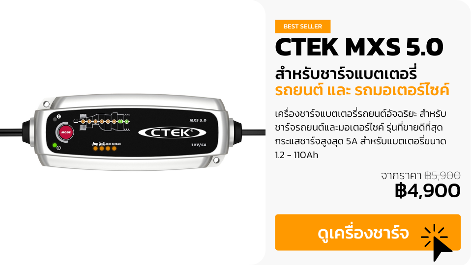 โดยเครื่องชาร์จแบตเตอรี่ CTEK ที่อยากแนะนำให้คุณได้ลองคือ CTEK MXS 5.0 เครื่องชาร์จแบตเตอรี่สำหรับรถยนต์และมอเตอร์ไซค์ (รถ EV ก็ใช้ได้) มีกระแสชาร์จสูงสุด 5A สำหรับแบตเตอรี่ตะกั่ว-กรด 12V ขนาด 1.2 - 110Ah รุ่นนี้เป็นรุ่นที่ขายดีที่สุด ใช้งานง่ายไม่ยุ่งยาก ไม่มีความรู้เรื่องช่างก็สามารถใช้งานได้
