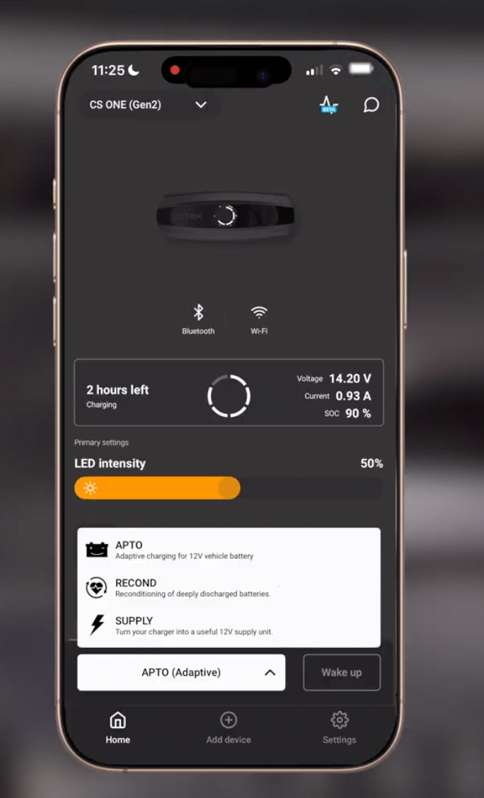CTEK CS ONE นั้นฉลาดมากจนยกระดับความเรียบง่ายไปอีกขั้น คุณจะไม่ต้องเสียเวลากับปุ่มหรือโหมดต่างๆ ด้วยข้อมูลทั้งหมดที่คุณต้องการอย่างชัดเจนผ่านหน้าจออัจฉริยะอันเรียบง่าย มาพร้อมกับแอป CTEK ที่ดาวน์โหลดได้ฟรีโดยเฉพาะ ซึ่งจะปลดล็อกคุณสมบัติเพิ่มเติม เช่น 'RECOND' เพื่อฟื้นฟูสุขภาพแบตเตอรี่ 'WAKE UP' สำหรับแบตเตอรี่ลิเธียมที่มีการป้องกันแรงดันไฟต่ำ (UVP) หรือเพื่อนำแบตเตอรี่ ตะกั่ว-กรดที่คายประจุออกไปมากกลับมาใช้งานได้อีกครั้ง และ 'SUPPLY' เพื่อเปลี่ยน CS ONE ให้เป็นแหล่งจ่ายไฟ 12V แอป CTEK ยังได้รับการพัฒนาเพื่อให้คุณควบคุมได้อย่างสมบูรณ์ผ่านสมาร์ทโฟนของคุณ